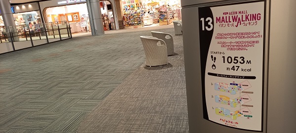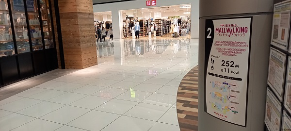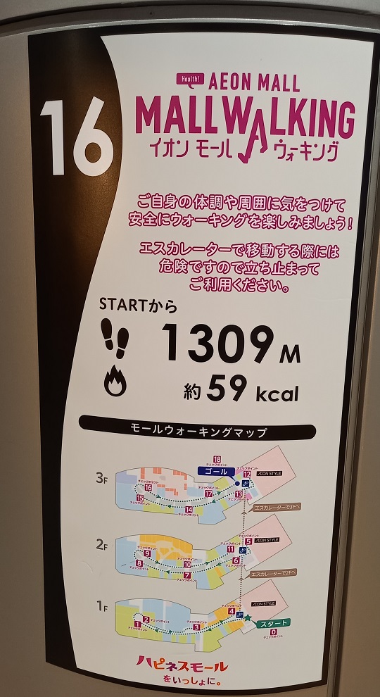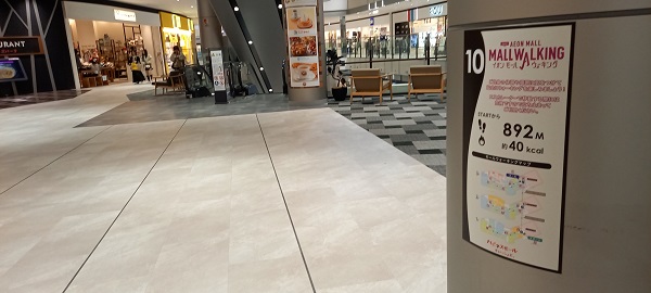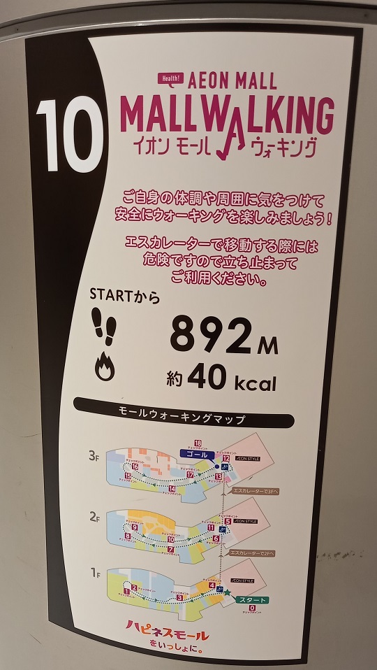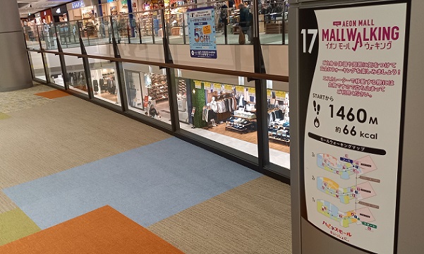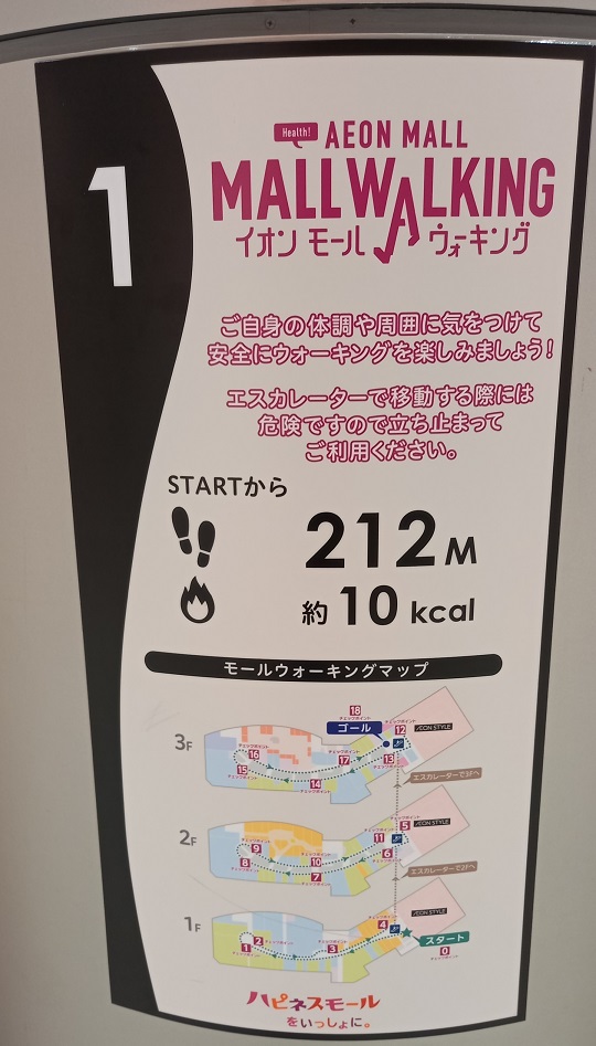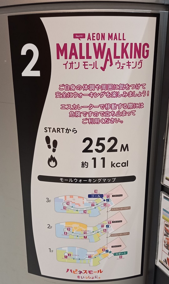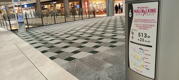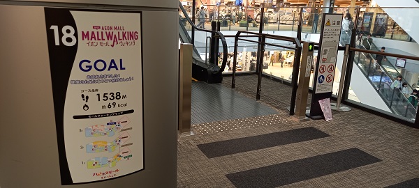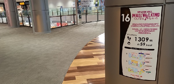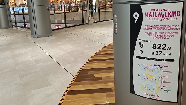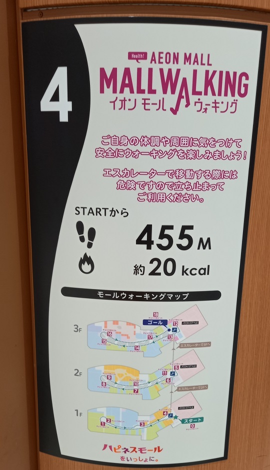 前回この場所を取材したときはまだありませんでしたが、イオンモール四條畷独自のものではなく、全国のイオンモールにある案内板と共通表示のコースが設置されていました。(2025年4月1日取材) |