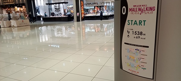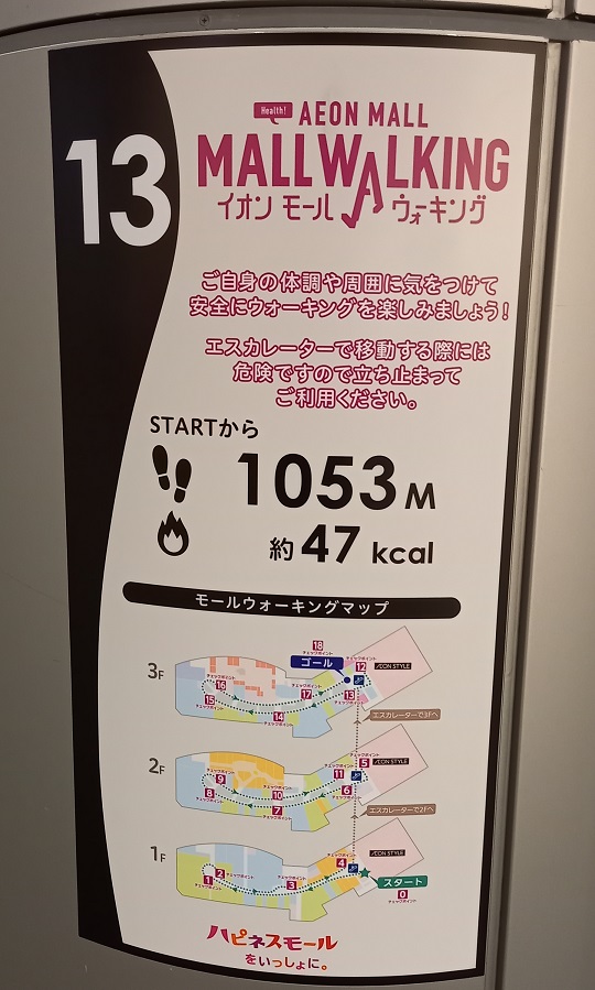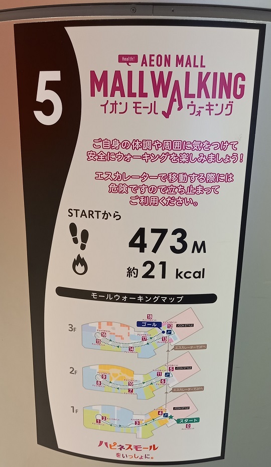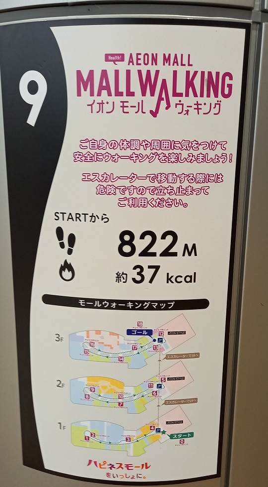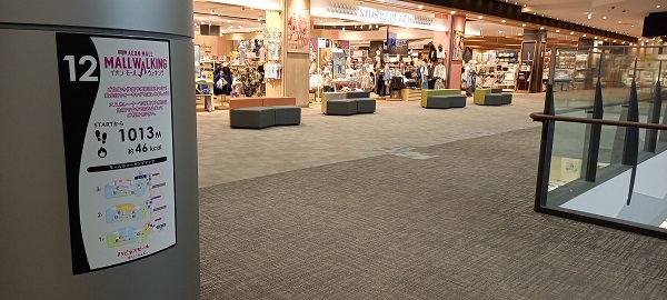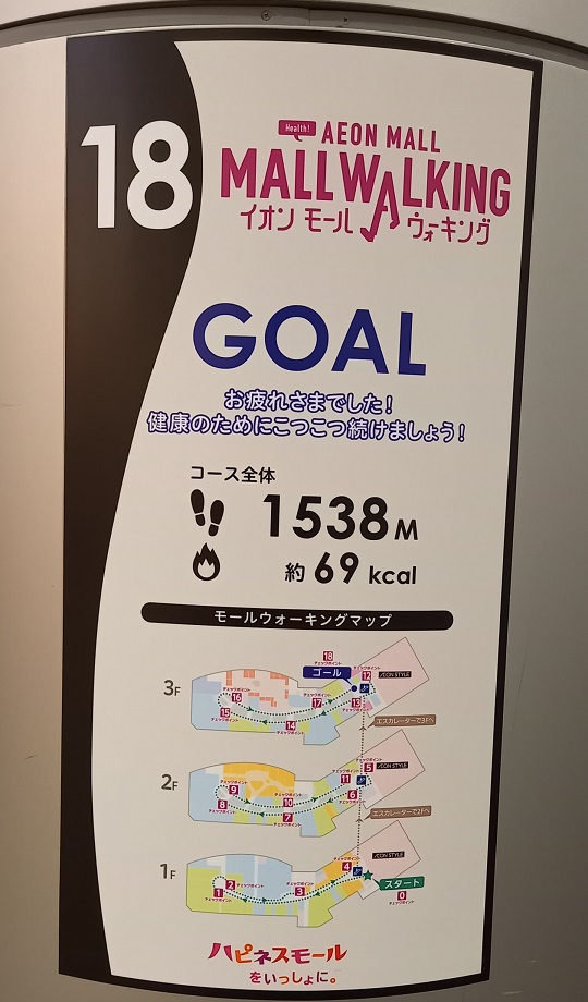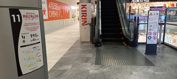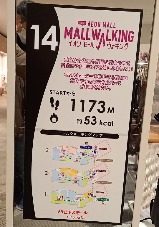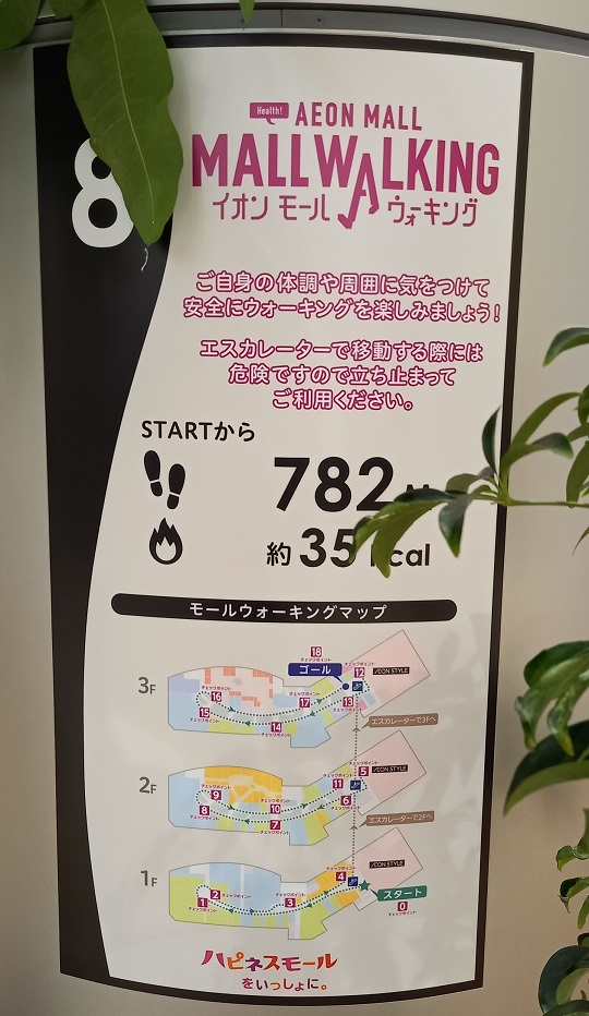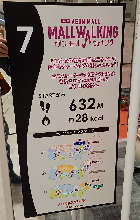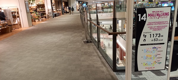 前回この場所を取材したときはまだありませんでしたが、イオンモール四條畷独自のものではなく、全国のイオンモールにある案内板と共通表示のコースが設置されていました。(2025年4月1日取材) |