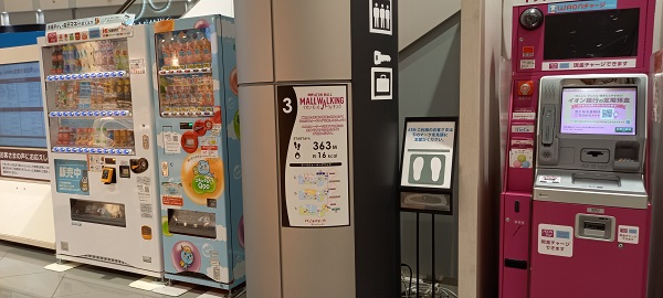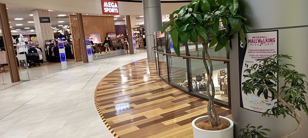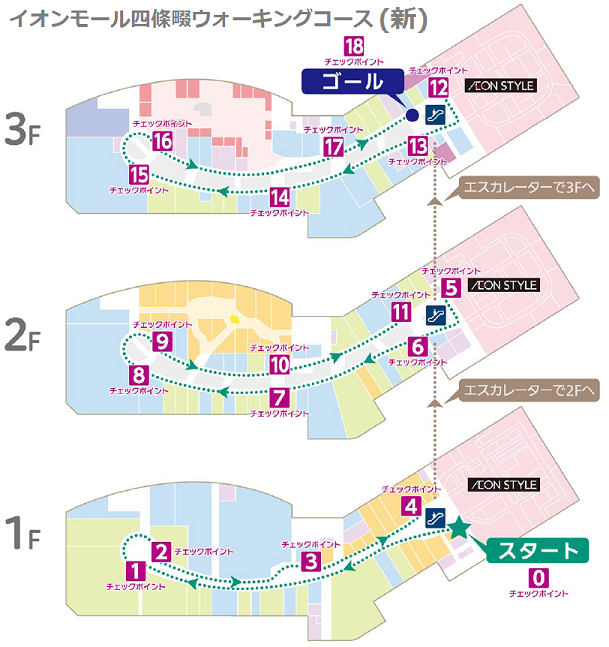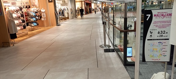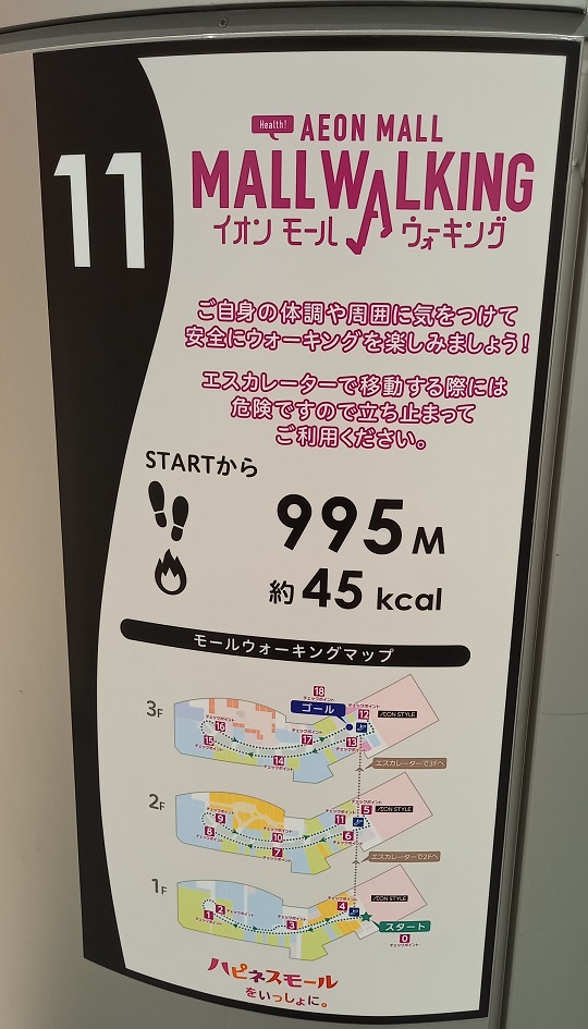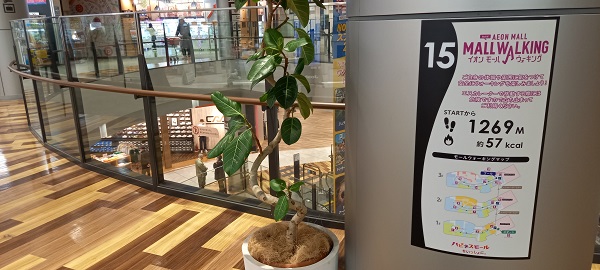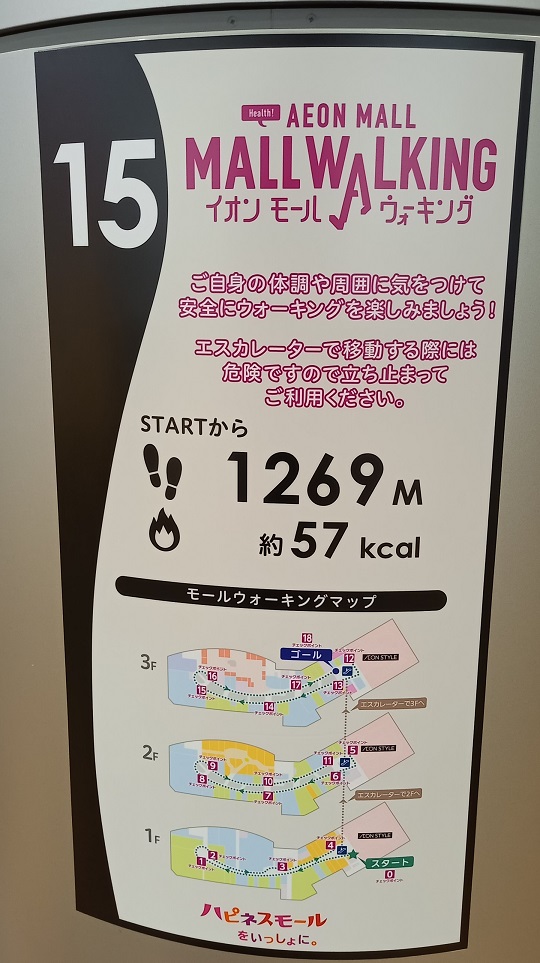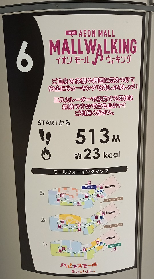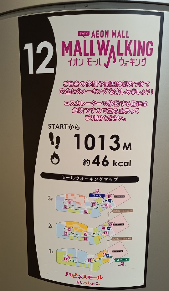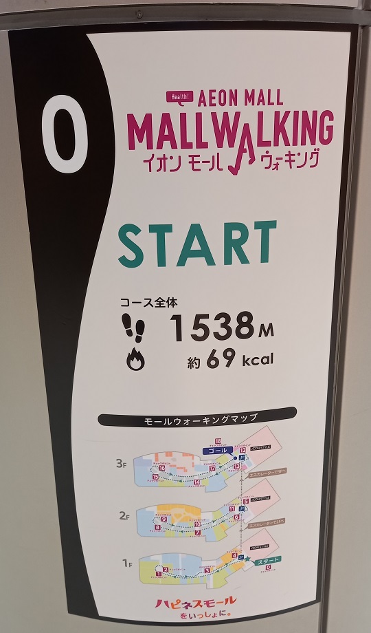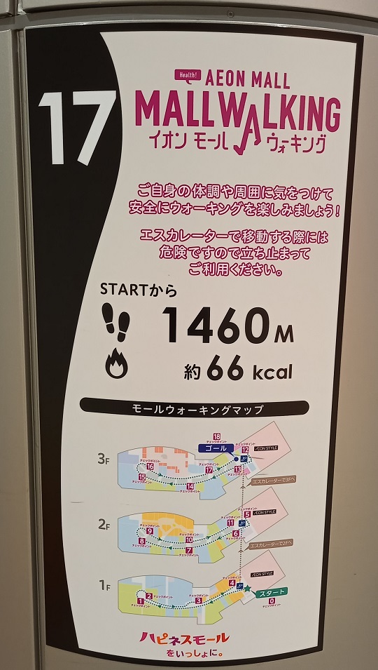 前回この場所を取材したときはまだありませんでしたが、イオンモール四條畷独自のものではなく、全国のイオンモールにある案内板と共通表示のコースが設置されていました。(2025年4月1日取材) |