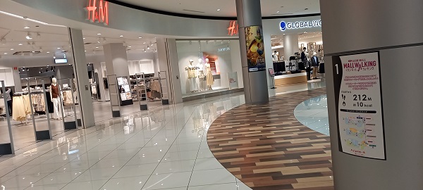 H&Mの正面の円柱。モール内ストリートを端から端まで歩いた場所。10キロカロリーも焼死できるのもわかる。